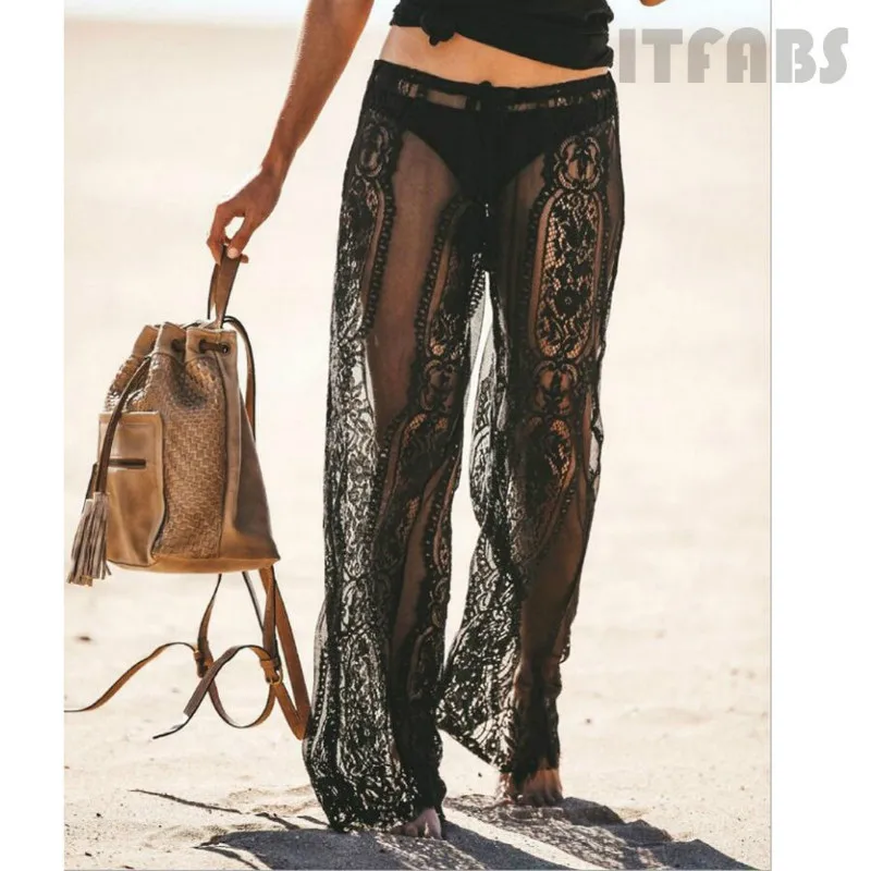 Best Offer 2019 Fashion Summer Club Sexy Women Lace Long Pants Lady Low Waist Loose Hollow Out Beach Party Trousers